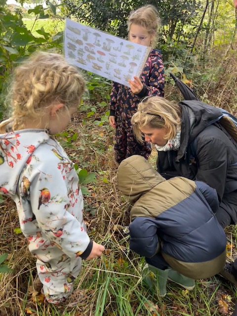 Vervolgens op zoek naar paddenstoelen, de ouders, die zoeken enthousiast mee! De meegebrachte eetbare champignons zijn een prima manier om veilig zo’n schimmelvrucht te onderzoeken. Ook beantwoorden de kids vragen over welke drie dingen de paddenstoelen nodig hebben om te leven: vocht, voeding en een manier om hun sporen te kunnen verspreiden. Ze bekijken en onderzoeken de paddenstoelen daarvoor goed en met spiegeltjes kijken ze onder de hoed. Ze leren dat de schimmels dé opruimers in de natuur zijn.