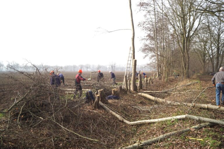 Bij het landgoed de Berkt in Heesch van de familie de Laat staat een lange elzenrij aan de Schaapsteeg, welke terug gezet werd. De bomen werden hiervoor door de vrijwilligers van het IVN tot laag bij de grond afgezaagd. Ze zullen weer uitschieten en een houtwal gaan vormen, zodat het er aantrekkelijker wordt voor het dierenleven. Om het werk toch wat vlotter te laten verlopen werd ook de electrische kettingzaag gebruikt.