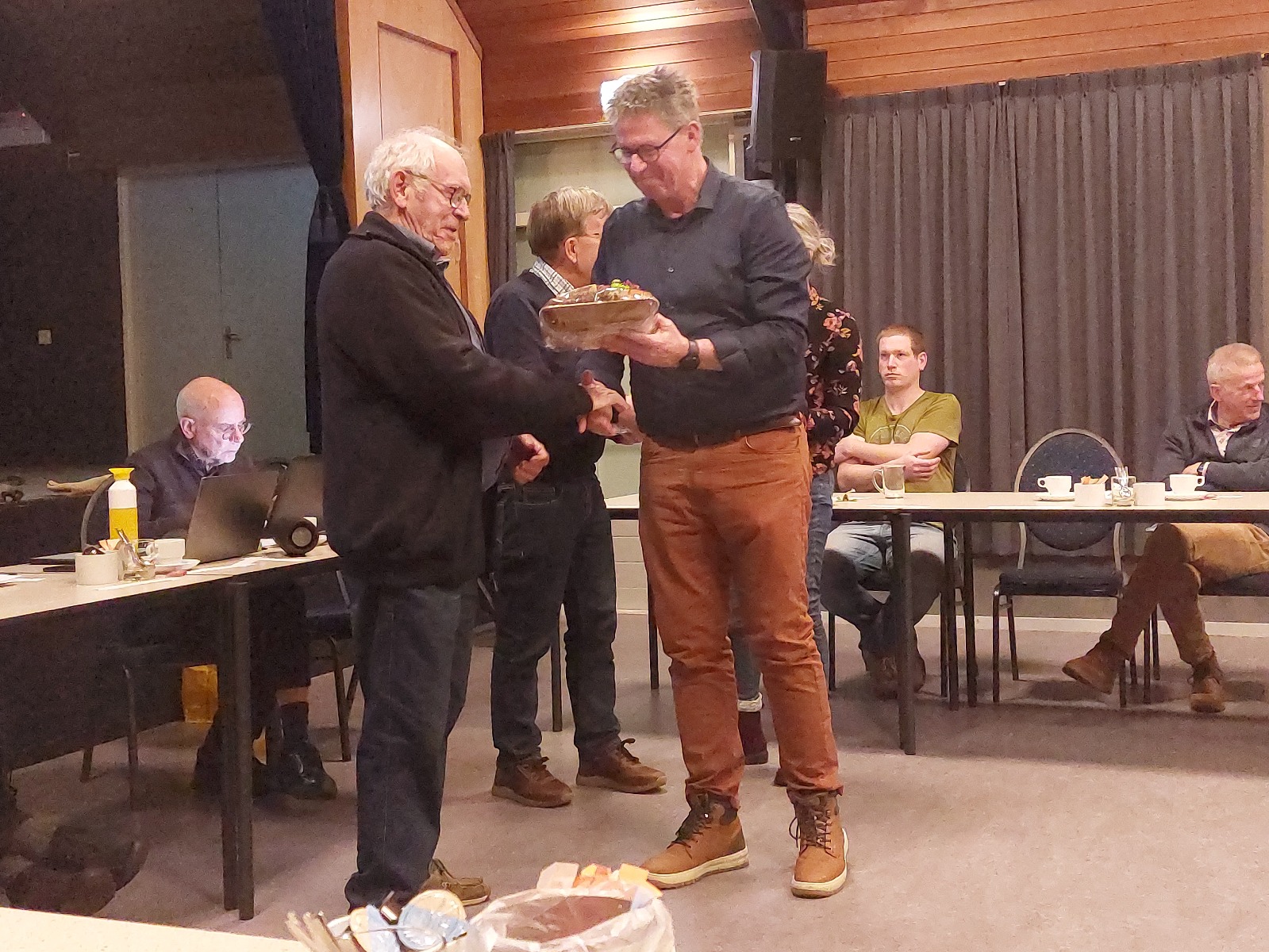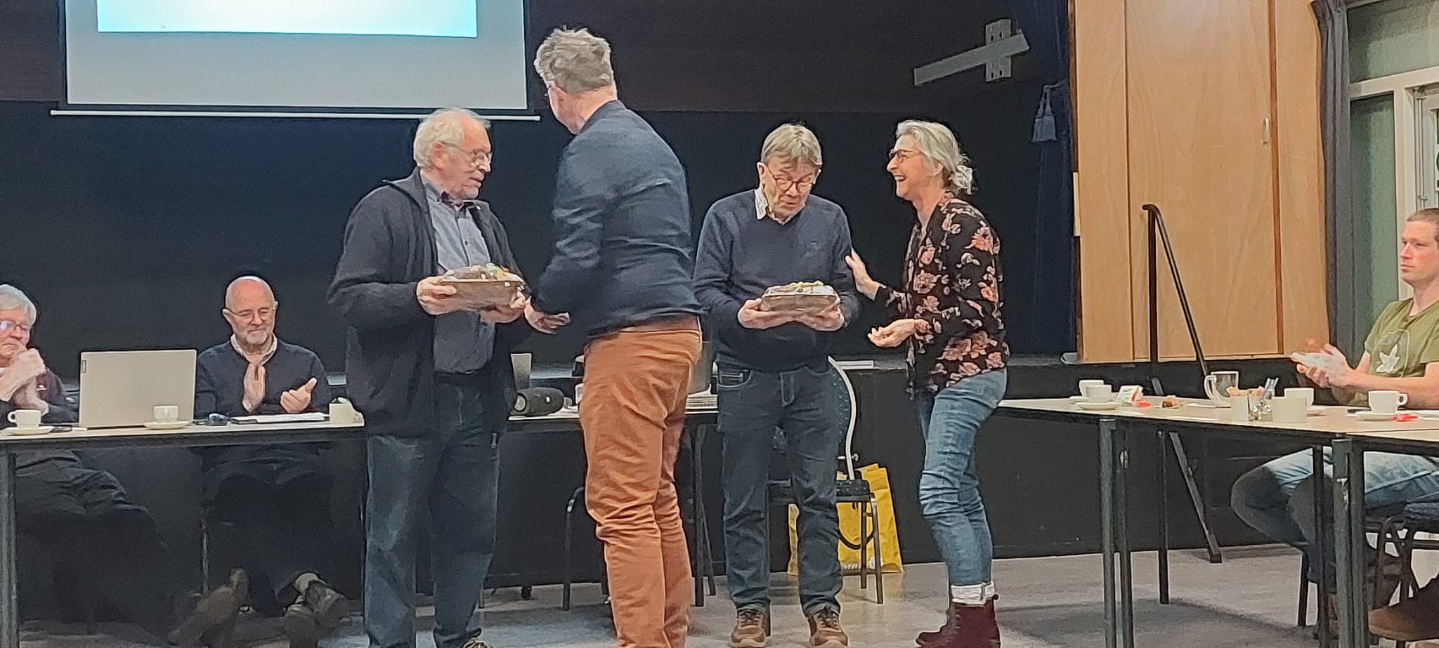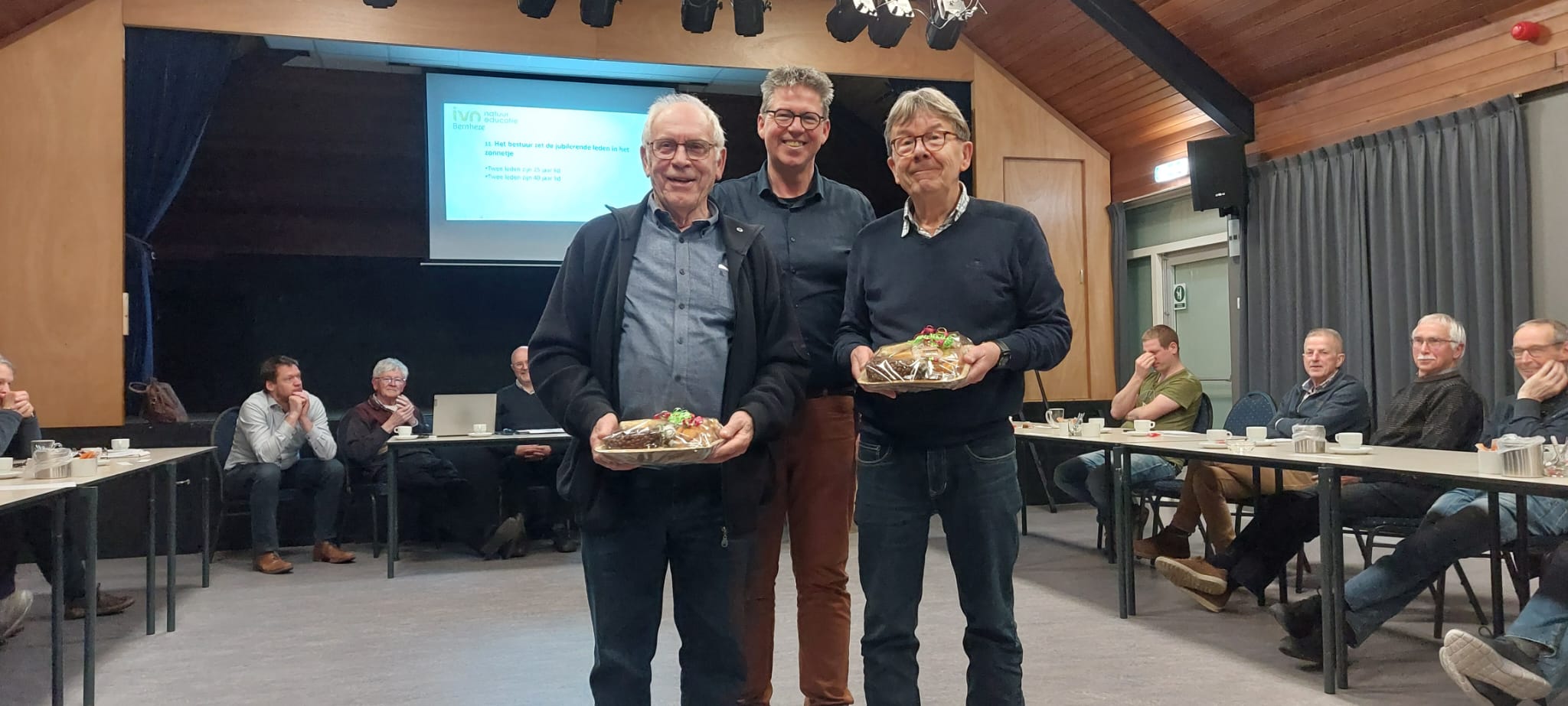 Daarna werden Hans van Sleuwen en Jan van den Broek voor hun 40 jarig lidmaatschap door voorzitter Lambert van der Ven toegesproken. Hans met een grote verdienste in de beginjaren van IVN met zijn jarenlange betrokkenheid bij de VENEL, maar ook de wijze waarop hij IVN Bernheze op de kaart heeft gezet in het politieke domein van de gemeente Bernheze. Jan met zijn jarenlange inzet, tot op de dag van vandaag, in allerlei werkgroepen en activiteiten, waarbij het IVN Bernheze verbindt aan allerlei lokale en gemeentelijke intiatieven. Voor beiden was er een mooie attentie als dank!