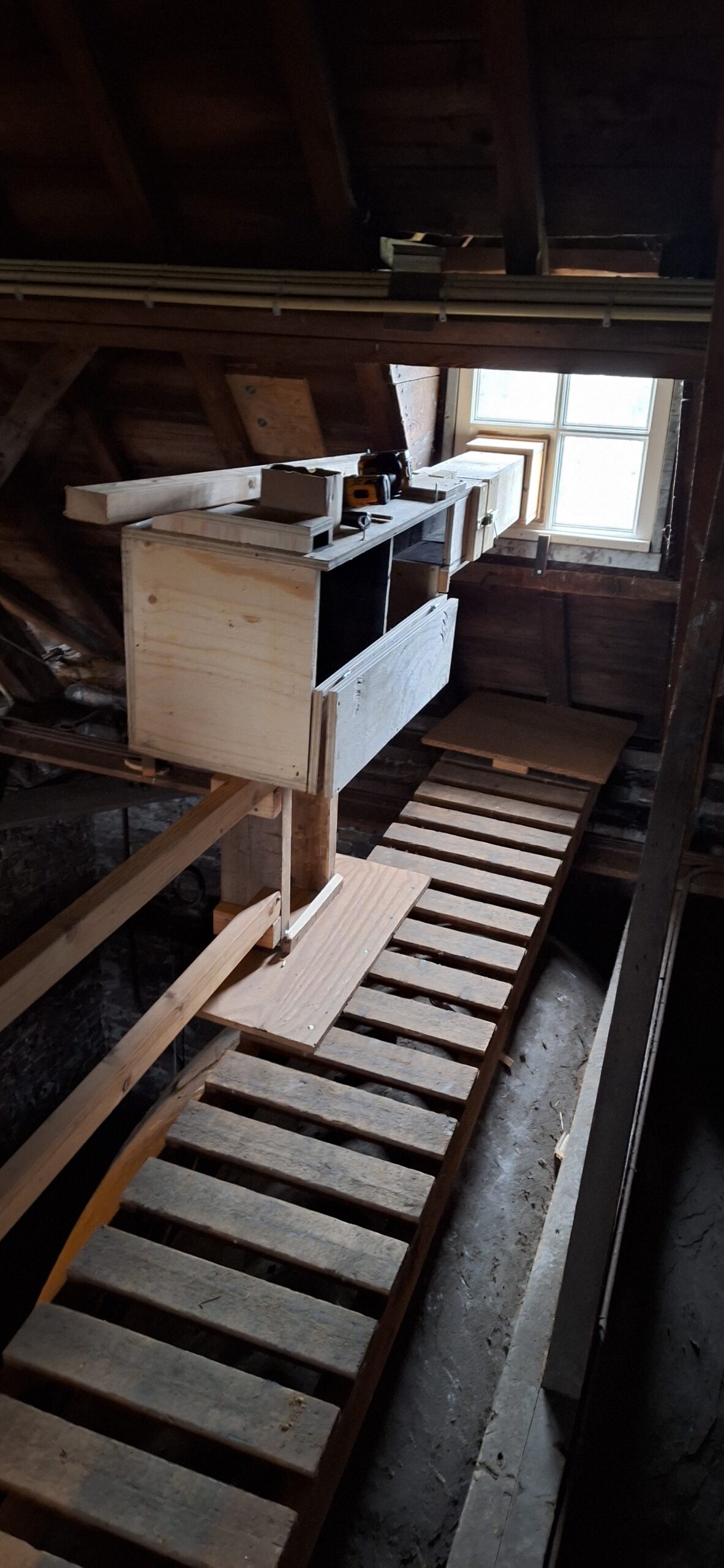 Deze zaterdag werd de kast geplaatst door John Broeren, John Davies en Jos van Empel van de uilenwerkgroep. Het was een zware klus met het naar boven sjouwen van alle materialen. Naast het plaatsen van de kast werden er ook nog enkele maatregelen getroffen om de veiligheid voor de werkgroep, tijdens het beheren van de kast, te vergroten. In november wordt een uilenkast schoongemaakt en in mei maken de werkgroepleden een rondje langs alle uilennestkasten van Bernheze om het aantal uilen te tellen. En nu maar hopen dat zich de komende maanden een kerkuil meldt, die het zo goed naar haar zin heeft dat zij het voorbeeld van de kerkuilen in de Heeswijkse kerk volgen. Daar zitten al drie jaar op rij kerkuilen met succesvolle legsels en uitgevlogen ‘jonkies’.