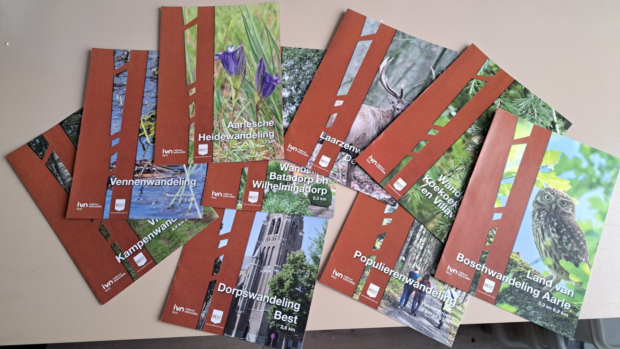 De folders van de negen wandelingen zijn op te vragen bij het secretariaat van IVN Best (secretariaat.ivnbest@gmail.com), maar ze liggen vanaf september ook op verschillende locaties in Best, waar ze gratis meegenomen mogen worden.