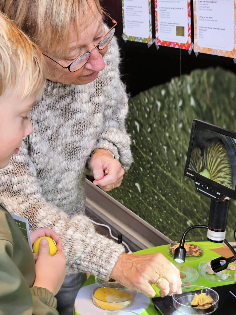 De microscopiedag is een initiatief van de Rijksuniversiteit Groningen. Vorig jaar kregen we van hen een digitale microscoop. Toen stonden we met onze microscoop in het Hunebedcentrum. Deze keer kozen we voor het centrum van het dorp. Een goede keus blijkt achteraf er was veel belangstelling.