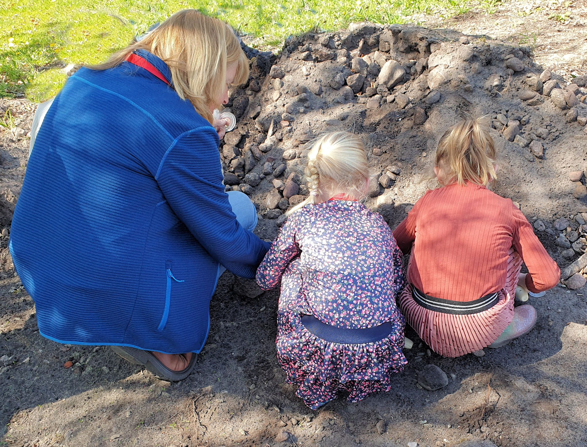 Hier kwamen ook nog veel bezoekers met kinderen meedoen. Zodat er zeker twintig kinderen actief waren. Ze hadden er heel veel zin en vonden het spannend wat er ging gebeuren. Koos vertelde in het kort wat bodemdiertjes doen en het nut ervan. Daarna gingen de kinderen met een loeppotje, een zoekkaart, een lepel of een schepje aan de slag. Stenen werden omgekeerd, boomstammen verplaatst en driftig gegraven in het zand…. De opbrengst was geweldig! Een duizendpoot, pissebedden, een groene sprinkhaan, een pad, wormen, torren en heel veel slakken. Alles werd in een grote bak verzameld en goed bekeken. Grappig was het om een worm over een A4tje te laten kruipen, zodat je hem kon horen ritselen. Al met al een zeer geslaagde middag en veel blije kinderen.