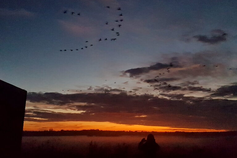 De avond begon met een prachtige kleurrijke schemering. Grote groepen ganzen vlogen luidruchtig over, op weg naar hun rustplek voor de nacht. Vervolgens voerde de wandeling ons langs het kwel moerasgebied en naar de superterp waarop het hart van LOFAR is gestationeerd.