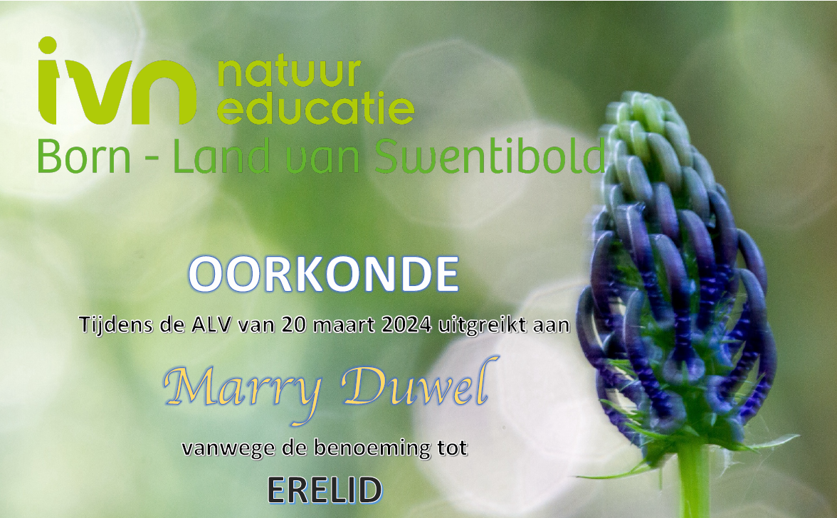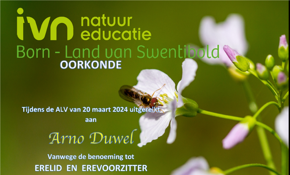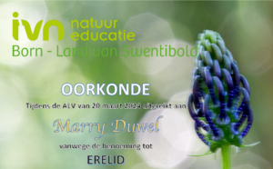 Hoe echter had Arno zoveel voor de vereniging kunnen betekenen zonder de niet aflatende steun van zijn echtgenote Marry. Ook haar komt alle lof toe! En dat niet enkel vanwege haar steun aan Arno, maar meer nog vanwege haar eigen verdiensten binnen het IVN.