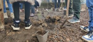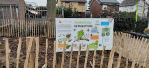 Waar eerst tegels lagen en een muurtje stond, ligt nu verse grond omringd met een schapenhek. Hovenier Gavin (GF Groen), educatiemedewerkers Lucienne en Lianne (Stichting De Rollen) en IVN’ers Ria, Jelle en Lieve zijn de 30 verschillende plantensoorten aan het uitzetten volgens het beplantingsplan. Dat trok de aandacht van de kinderen die buiten spelen.