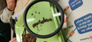 Aan de andere tafel werden regenwormen, pissebedden en andere bodemdiertjes bestudeerd. Lucienne vertelde over het nut van deze diertjes. Een regenworm besloot een demonstratie te geven van zijn nut in de natuur door te poepen. Dat maakte indruk!