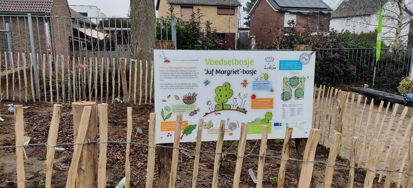 Snel werd het informatiebord opgehangen en bedekt met een laken, zodat de naam van het Voedselbosje nog even een verrassing blijft.