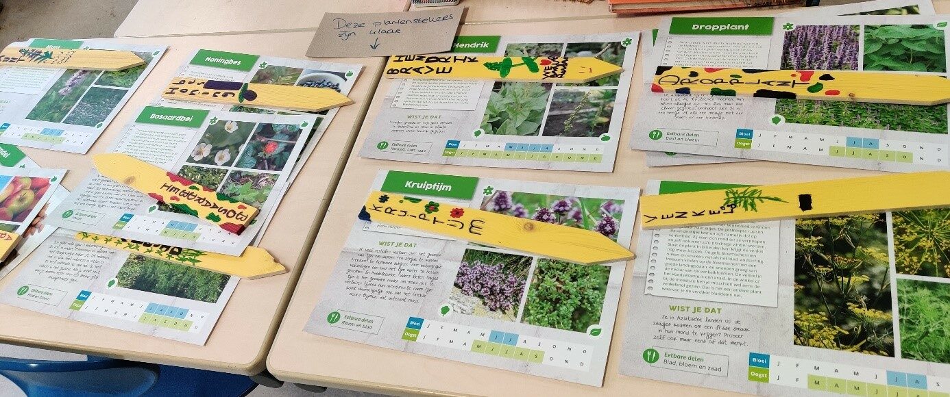 De achtstegroepers gingen aan de slag, want dat bosje moest natuurlijk nog de grond in. Voor een aantal leerlingen was dit de eerste ervaring met het aanplanten van groen. Gavin en Ria ondersteunden de leerlingen hierbij. Binnen versierden leerlingen plantenstekers, waar de namen van de soorten op komen de staan. Door de soortenkaarten die bij het bosje horen, maakten de kinderen kennis met het plantgoed en hun toepassing. ‘Colakruid, wordt daar ook echt cola van gemaakt?’