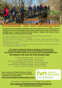 De regionale Cursuswerkgroep organiseert deze afwisselende cursus voor wie meer wil weten over alle mooie, interessante en eigenaardige zaken die in de natuur in De Kempen te ontdekken zijn. De cursus is bedoeld om meer plezier te krijgen in het beleven van de prachtige natuur en het landschap in de Kempen.