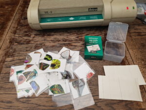 - Knip uit de bladen afbeeldingen van bijvoorbeeld vlinders of andere insecten die passen op zo’n strook papier van 5 x 10 cm.
