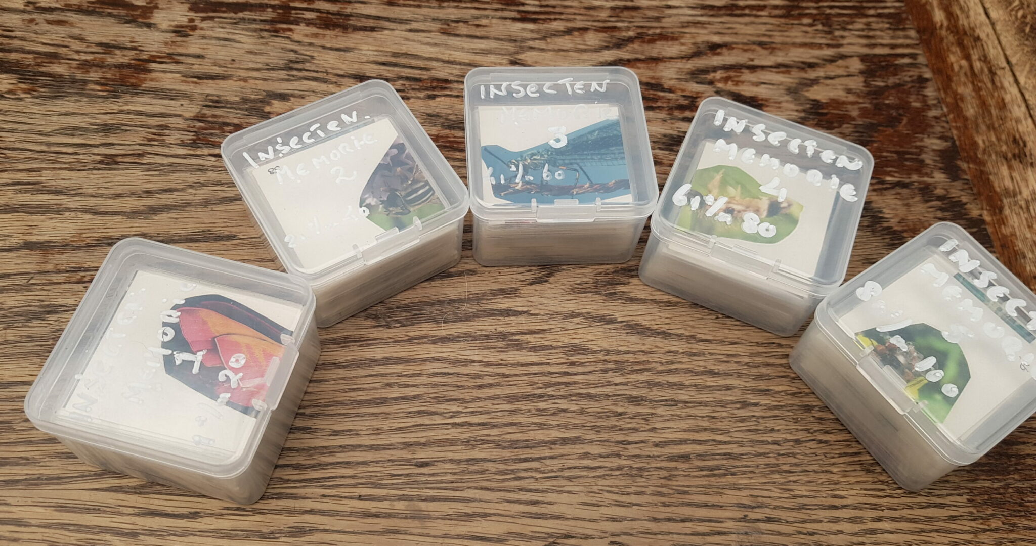 Het idee van het memoriespel is dat je bij elkaar horende kaartjes gaat verzamelen. Je kunt de kaartjes (eerst) gewoon open op tafel leggen waardoor men de bij elkaar horende kaartjes moet vinden. Dan is het eigenlijk meer een puzzelspel. Of je maakt er echt een memoriespel van en legt ze allemaal blind neer. Het wordt dan wat moeilijker maar wel leerzamer: