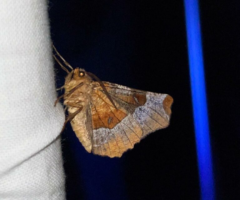 Dat viel wel wat tegen maar dat was ook niet verwonderlijk. De meeste nachtvlinders gaan pas echt vliegen als het al wat langer donker is. Toch verschenen er wel diverse insecten, zoals hommels, meikevers etc. En ook enkele nachtvlinders waaronder diverse Meriansborstels en een Halve Maanvlinder (zie foto).