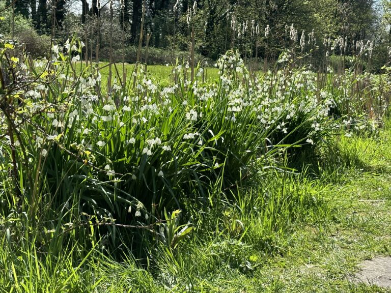 Bij stinzenplanten gaat het om van elders komende bol/knolgewassen die rondom een stins (stenenhuis) geplant werden. In de loop der tijd zijn deze planten verwilderd en hebben ze een eigen functie gekregen in het ecosysteem. Door de opgeslagen voedingsstoffen in de bol, knol of wortelstok, zijn ze instaat om een snelle groeispurt te maken en vroeg in het voorjaar te bloeien. Soms geeft de naam van de plant dit al aan, zoals het sneeuwklokje en de winterakoniet. Deze waren dit jaar vanwege de hoge temperaturen al ruim voorbij hun bloei. Andere soorten stonden wel volop in bloei, zoals het zomerklokje (zie de foto bij dit bericht), boshyacint, sneeuwroem, de kievitsbloem, bosanemoon, hartbladzonnebloem, ossentong, salomonszegel, voorjaarshelmbloem etc.