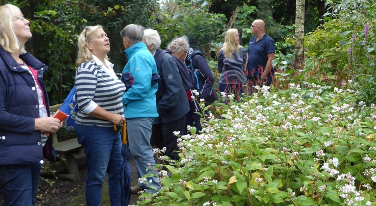 Heerlijk zo halverwege de wandeling. Dan gaan we weer verder. Er staan o.a. vlinderstruiken, pimpernel, Russische lavendel, diverse soorten rozen enz. Op een gegeven moment krijgen we van Elly van den Oever, de eigenaresse die ons een rondleiding geeft, ongeveer 5 bladeren. Die moeten we aan elkaar doorgeven. Kneuzen en ruiken. Wat ruiken we is de vraag, ik weet het niet. Iemand oppert: ‘drop’? Jitske Brouwer, ons allernieuwste lid, zegt: , pindakaas’. Ja, dat is het. Wonderlijk, een boompje die naar pindakaas ruikt. Aan het eind gekomen van de wandeling kopen meerdere leden één of meer planten. We danken Elly en Floris van den Oever voor het mogen bekijken van hun tuin. De tuin heet de Oevertuin, ten eerste natuurlijk omdat Floris ‘van den Oever’ heet en omdat de tuin zoveel oevertjes bevat. Met allerlei nieuwe ideeën voor onze eigen tuin gaan we naar huis. Het is een mooie zaterdagochtend besteding geweest.