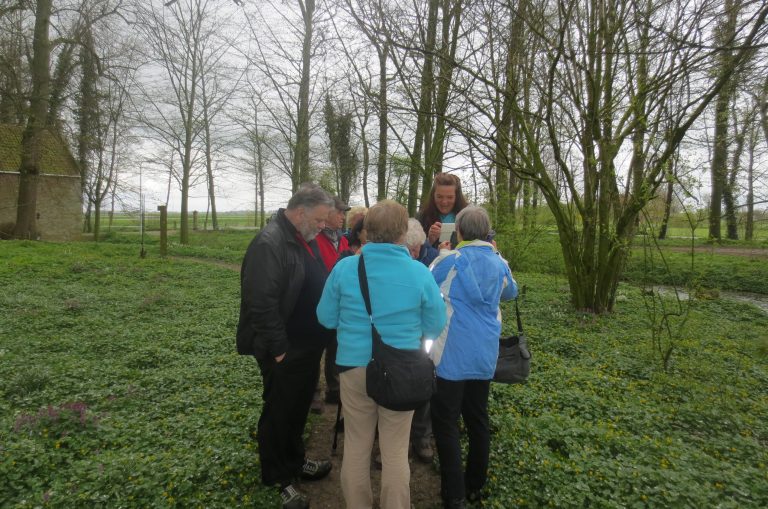 Het planten bewonderen begon al bij aankomst, waar we door een haag van groothoefblad langs de slootwal naar het poortgebouw werden geleid . Binnen in het park was de bodem bedekt met een tapijt van speenkruid en daar tussen de planten waar wij voor kwamen. Het begon al met de bostulp, daarna gingen we stoeien met de helmbloem en holwortel, hoe onderscheid je die nu van elkaar. Gelukkig konden onze gidsen Anneke en Ineke dit prima uitleggen door naar het blad net onder de bloem te kijken, ook heeft de holwortel een holle knol maar wij gaan natuurlijk geen planten uit de grond trekken gelukkig hebben we daar foto’s voor en ook bij ons. Verder ontdekten we de bloedzuring met zijn gevlekt blad, het daslook en zenegroen herkenden we eveneens aan het blad net als nog vele anderen, dit omdat alles nog niet bloeide maar op deze manier planten herkennen is ook leuk. Zo ook de vele aronskelken. De boshyacinten bloeiden weelderig en kleurden het vele groen hier en daar blauw en de wilde primula’s fris geel. Ook staken de oranje keizerskronen fier boven dit alles uit, zo als een keizer betaamt maar of dit nu echt stinsen planten zijn betwijfel ik. Men heeft gedacht deze bol staat hier ook mooi en vroeger haalde de gegoede stinsen bewoner zijn planten immers ook van ver. We hebben ook nog even naar de bomen gekeken die waren nog kaal behalve af en toe eentje wit van vogelpoep, want in bomen maken vogels nesten en tijdens het planten kijken waren de roeken hier druk mee doende onder soms veel gekwetter. Zo hadden we een echt voorjaarsgevoel net als de stinsen planten die vroeg in het jaar tot bloei komen. Hierna stonden we nog even na te praten over al dat natuurschoon van eens de familie Eysinga onder het nog overgebleven eeuwenoude poortgebouw om daarna huiswaarts te keren met het besef een stukje geschiedenis gezien te hebben.