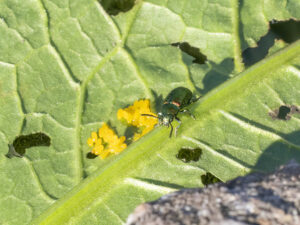 Het Zuringhaantje ( hoezo haantje???) had haar plant al gevonden en een flinke portie eieren er op gelegd. Zo, de toekomst is verzekerd.
