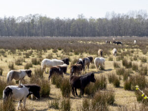 In een bepaald stuk van het gebied liepen wel 100 pony’s te grazen, een stukje verderop waren de geiten aan het werk, nieuwsgierig, maar ook wel wat schuw.