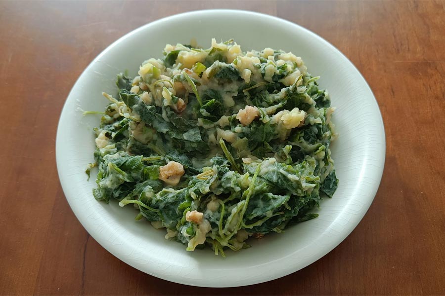 Romeinse kervel duidt op de plant als voeding. Het blad is rijk aan vitamine C en andere voedingsstoffen. Je kunt er bijvoorbeeld een stamppot van maken. Het recept dat ik voor deze column heb geprobeerd is het volgende: