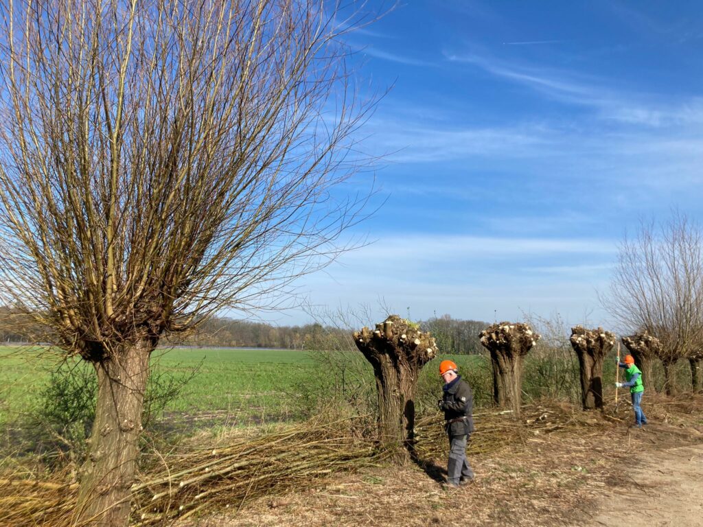 Vandaag is het de bedoeling dat diverse wilgen worden gekortwiekt. Ook een appelboom had een grote onderhoudsbeurt nodig. Aan het eind van de ochtend is het allemaal goed gelukt.