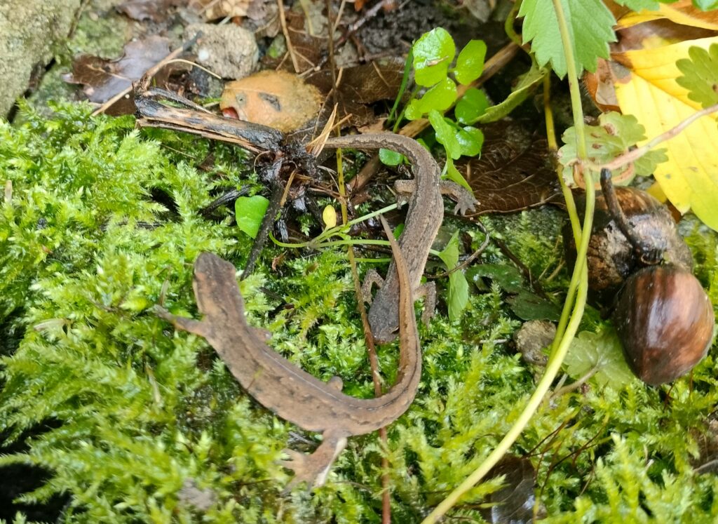 Onderweg vinden we zeer weinig, hier en daar een slak, zelfs de spinnenwebben zijn verwaaid of weggeregend. Een grote parasolzwam staat verstopt onder de struiken. Er is van gegeten. De kinderen denken dat een slak de dader is. We staan even stil bij een takkenhoop met stekelige braamtakken. Daar kunnen wel beestjes tussen zitten, misschien zelfs een egel. De stekels aan de takken houden ons tegen om verder te zoeken. In de beek zwemmen eenden met groene koppen en een krul in de staart. Dat zijn de mannetjes. Verderop zien we ook een bruine eend, het vrouwtje.