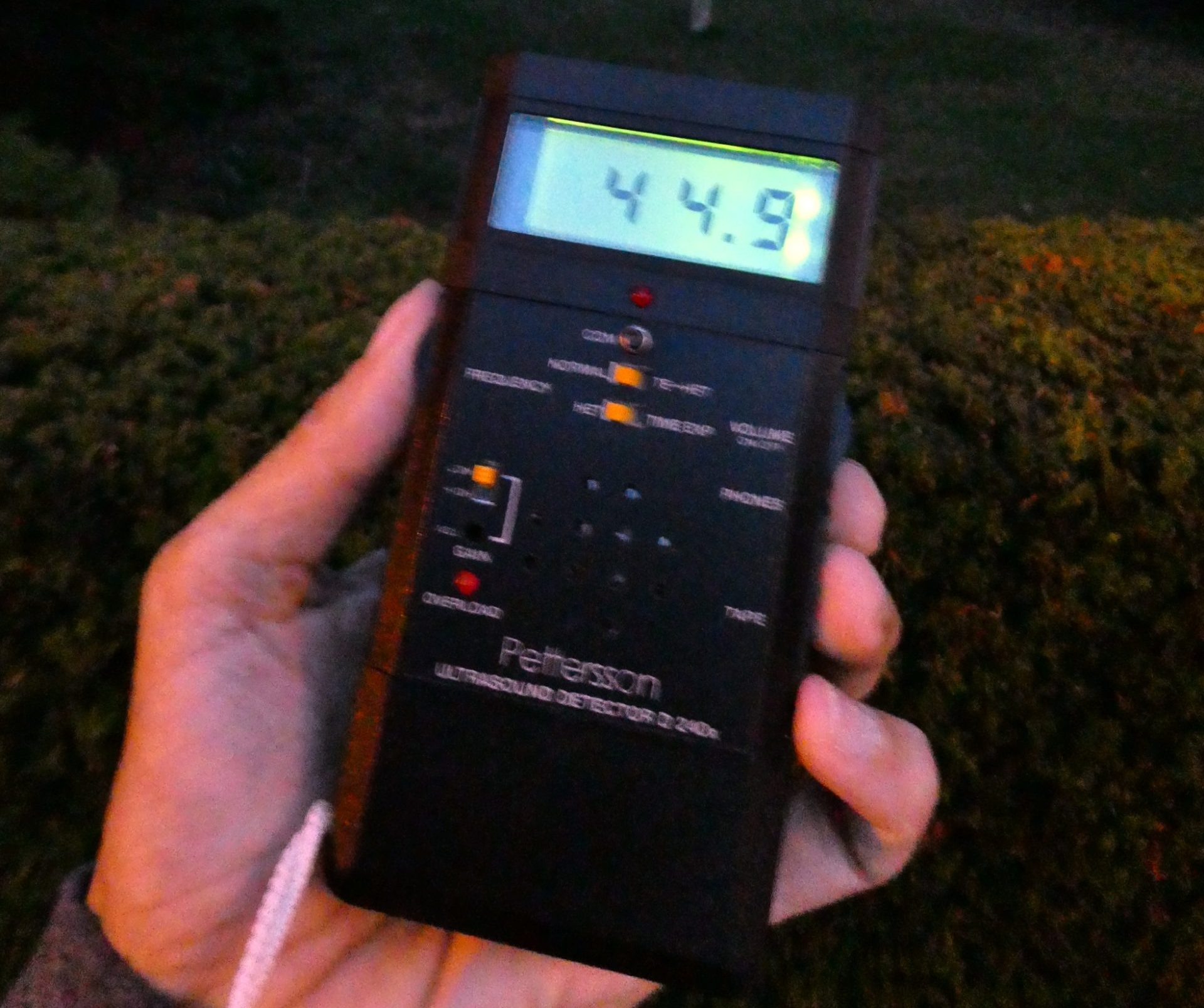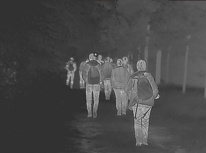 De groep liep langzaam richting de grote plas op het landgoed. Aangekomen bij het moerasgedeelte vlogen weer een paar dwergjes langs, nog redelijk te zien tegen de zwaarbewolkte avondlucht. Eenmaal aangekomen bij de kijkhut naast de plas ging het helemaal los; de batdetectors ratelden als een gekke. Behalve de vele jagende dwergvleermuizen werd er ook nog een rosse vleermuis opgepikt door een batdetector. Via twee warmtebeeldcamera’s kon het publiek toch de ‘vliegshow’ van de vele tientallen jagende vleermuizen boven de grote plas aanschouwen. Ook toen het te d
