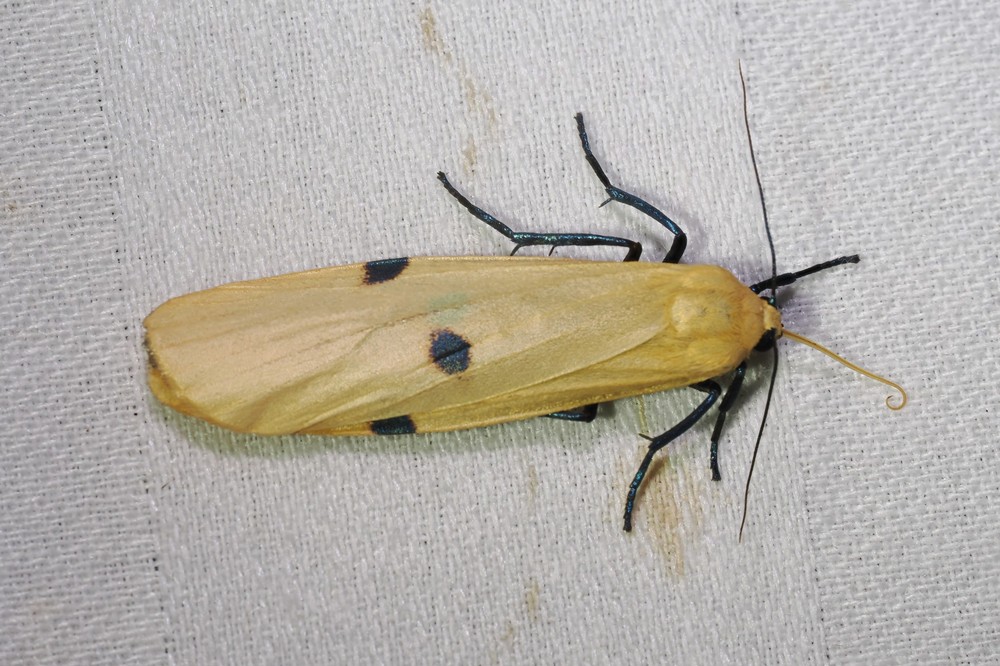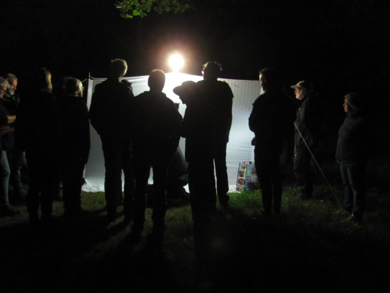 De avond was al geslaagd maar het toetje moest nog komen. Dus liepen we tegen 22.00 uur door naar de nachtvlinderopstelling elders op het landgoed. De lamp brandde al even dus er waren al verscheidene motjes te vinden op het laken. De mobiele telefoons kwamen tevoorschijn om ze op foto vast te leggen. Via nachtvlinderboek en app Obsidentify werden al snel verschillende soorten gedetermineerd: o.a. haarbos, gerande spanner, witte grijsbandspanner, boogsnuituil en bruine sikkeluil. Andere insecten zoals verschillende (langpoot)muggen, schietmotjes en wantsen kwamen ook op het licht af. Tevreden na een mooie en leerzame avond togen de meeste deelnemers tegen 22.45 uur naar huis. Enkele ‘nachtbrakers’ bleven nog even doorgaan totdat het begon te regenen en ze wel moesten stoppen.