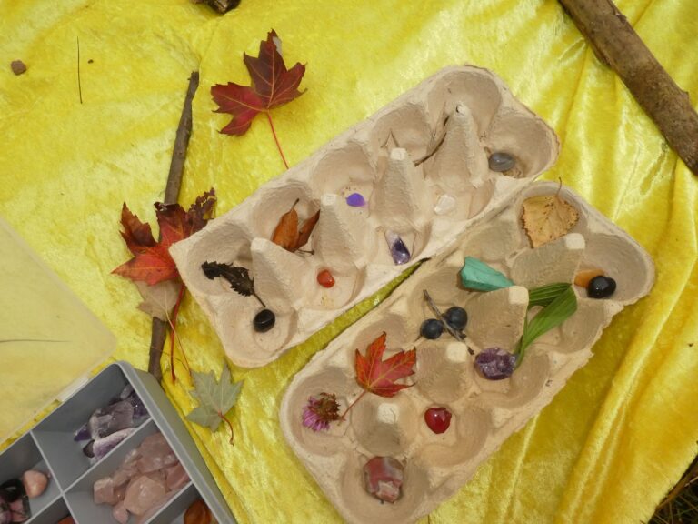 Daarna kozen de deelnemers fel gekleurde steentjes uit een doos en verzamelden daar in het park gelijkgekleurde voorwerpen bij. Er lag van alles in de eierdozen, mooie roze bloemen, groene en bruine bladeren, sleedoornpruimpjes en rozenbottels.