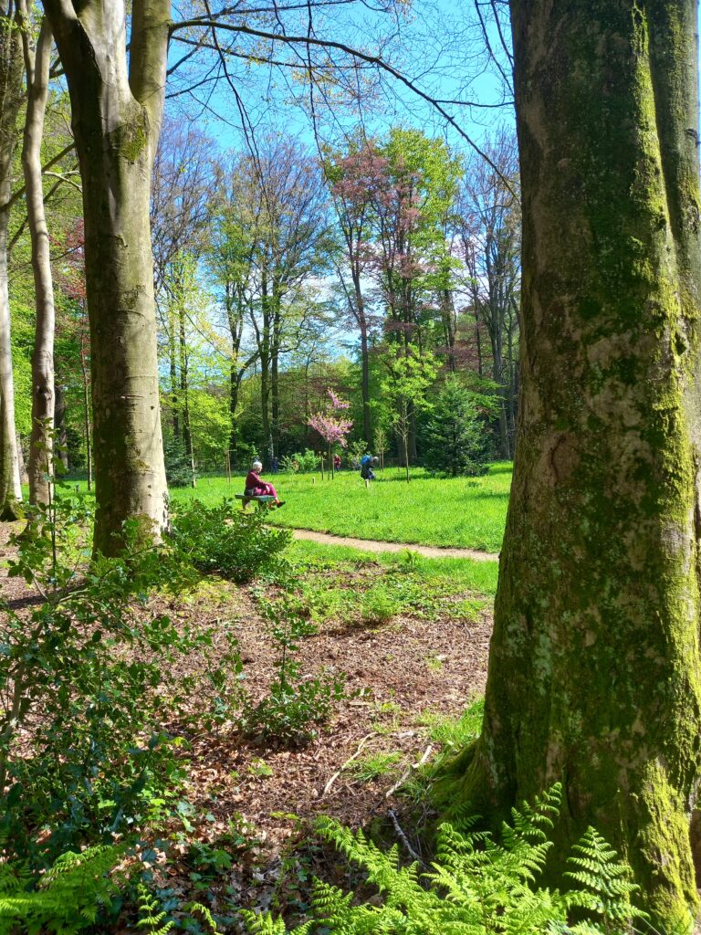 De wandeling wordt hier afgesloten zodat de mensen genietend vrij rond kunnen lopen, ‘hun’ boom kunnen zoeken en even tot rust komen bij de prachtige poel met zicht op bloeiende Rododendrons. Ieder gaat op zijn eigen tijd tevreden en verrijkt terug naar het startpunt.