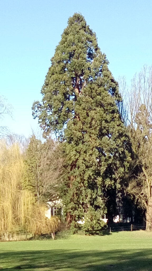 We hebben een prachtig zicht op de gigantische Mammoetboom, die in de tuin van het landhuis ’t Jagershuis staat. De boom is ongeveer 200 jaar oud.