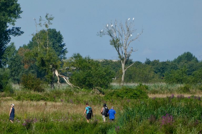 En ondertussen wordt het steeds heter. We pauzeren even in de schaduw van wat wilgenbomen die langs de oever van een Rijnstrang staan. Daarna lopen we door een met kruiden ingezaaid stuk terug dat niet toegankelijk is voor de runderen. De vegetatie staat daar manshoog en een vader neemt zijn dochtertje op de schouders. We ruiken aan de zwaar naar nectar ruikende akkerdistels en de naar wortel geurende wilde penen. Er vliegen veel hommels en jagende libellen.