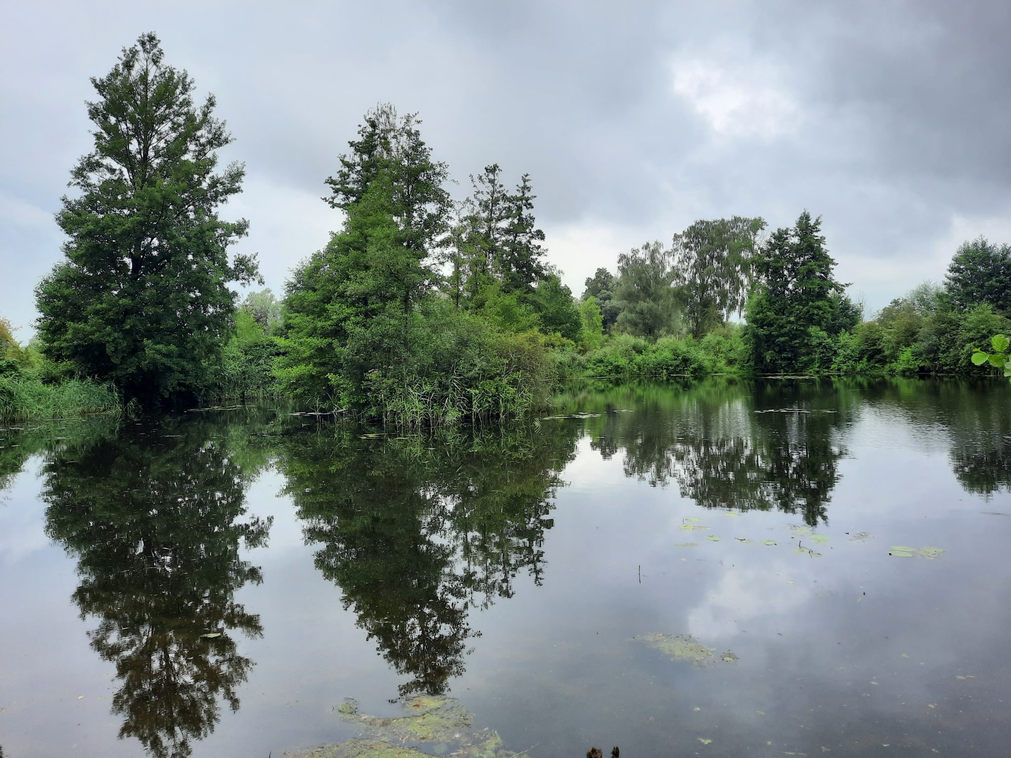 Op plaatsen waar wat grotere kleiputten liggen wijkt het bos en kijken we uit over het verstilde water.