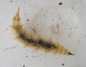Ook vingen we een – voor ons – nog een onbekende larve. Deze werd onder de binoculair nog even beter bekeken. Het leek nog het meest op de larve van een daas (steekvlieg), maar daar heb je meer dan een soort van, dus welke het precies is hebben we niet met zekerheid kunnen achterhalen. Er is wel een foto gemaakt en de waarneming is op Waarneming.nl geplaatst. Misschien dat de experts er nog een naam op kunnen plakken…