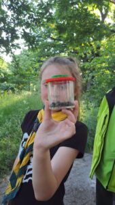 Marij: ”In twee groepen van elk vier welpen werd vrijdag 30 mei in de vroege avond gestart met de bodemdierensafari. Er werd niet gezocht naar de Big Five, maar naar de Tiny Ten, waaronder slakken,pissebedden, spinnetjes, duizendpoten en nog zes andere interessante bodemdiertjes.Met name de mieren, hun wijze van samenleven, had de aandacht, terwijl deze beestjes eens goed onder de loep bekeken werden. Ook de regenwormen kwamen goed aan bod; resten van huishoudelijk afval toonde aan dat de wormen hier wel raad mee weten. De kans is groot dat na deze safari, als een Welp een beetje in de put zit en de ogen alleen maar de grond gericht zijn, hij/zij toch weer snel vrolijk wordt van al dat speelse goed onder de voeten”