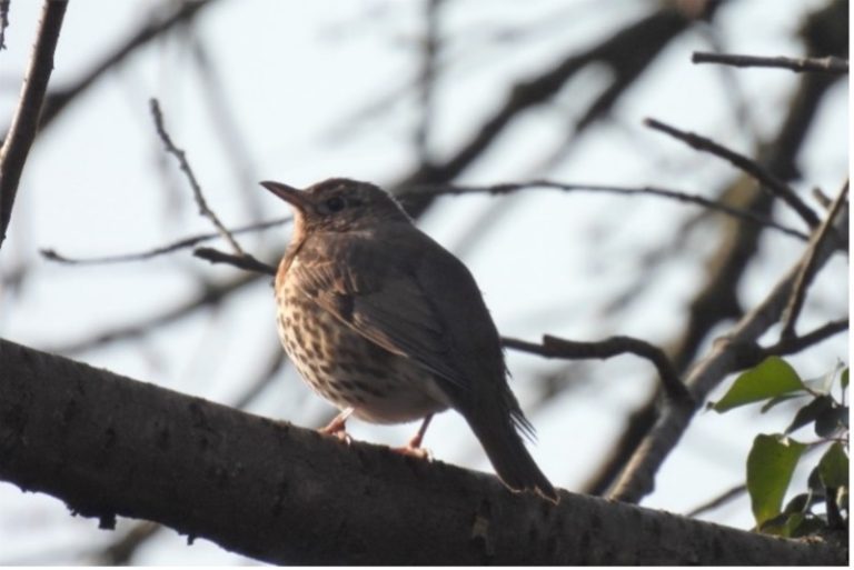 Een zanglijster zit op een tak bij een heldere lucht, omgeven door kale takken. Vogels
