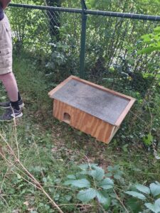 Aangezien het huisje een beetje scheef stond, vroeg ik of dat dit handig was om ervoor te zorgen dat de eieren van de egel naar het laagste punt van het nachthok bij elkaar rolden. Na een pijnlijke stilte merkte een snugger staflid op dat de egel levendbarend was. Om de Scouts betrokken te houden, stelde ik voor om een naam aan het egelhuisje te geven. Het werd “EGELHUIS TARCISIUS”. Dit bord wordt door de Scouts gecreëerd en feestelijk in het najaar geïnstalleerd.