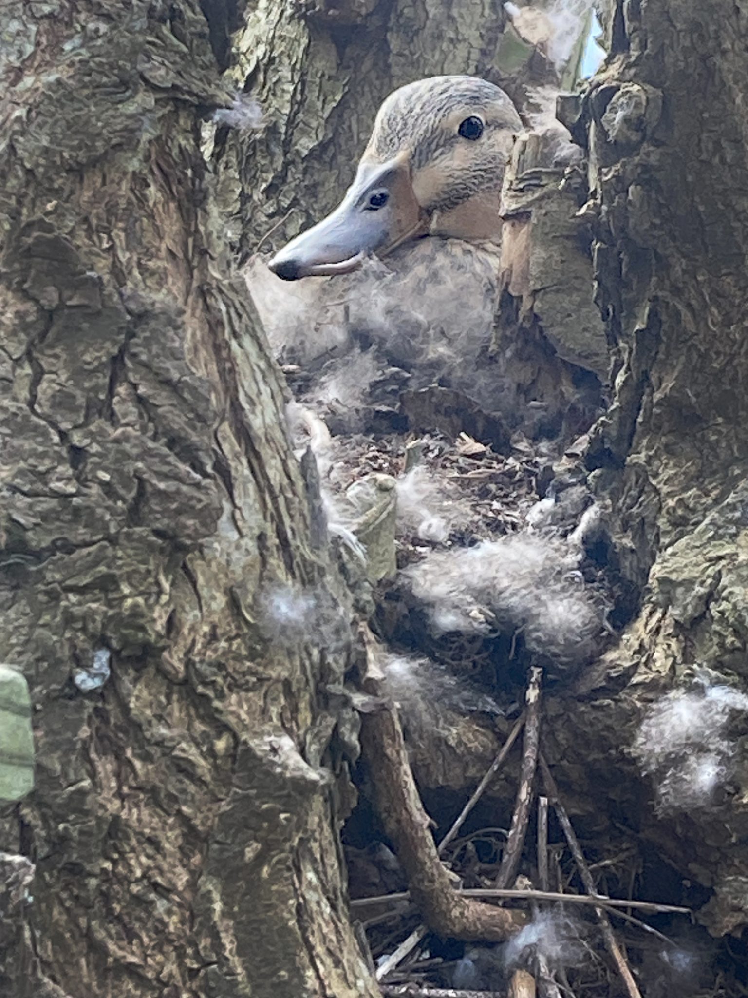 Tot de man eindelijk bij de grootste dikste wilg is van het hele rijtje. De boom heeft een knot van bijna een meter doorsnee. De afgezaagde takken steken aan de buitenkant van de knot nog iets omhoog. Zo is in het midden een kuil ontstaan. Dáár wil de eend wel even kijken. Dat doet ze en blijkbaar vind ze de plek wel beschut. Ze legt er in de volgende dagen tenminste acht eieren. De man verdwijnt. Ik moet goed kijken: zit ze er nog wel? En ja hoor, verstopt tussen de opstekende takken zie je, als je héél goed kijkt, haar kop of haar staart. Maar alleen als je weet dat ze daar zit. Verder ziet niemand haar, zelfs de ekster niet. Tot nu toe. Opeens lijkt deze plek haast veilig….