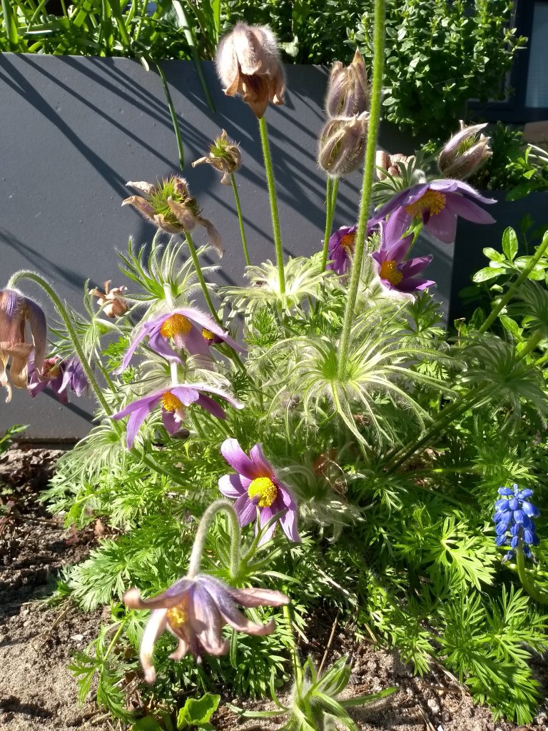 De paarsblauwe klokken maar ook de zaadpluizen van de Gewöhnliche Kuhschelle (Pulsatilla vulgaris) zijn bijzonder decoratief. Wildemanskruid, zoals wij hem noemen, bloeit in de periode maart-april met anemoonachtige bloemen. Ik heb iets met de schoonheid van deze plant. Een zeker in deze bizarre tijd zoek ik naar schoonheid. Wel even opletten in de winterperiode want het bovengrondse loof sterft helemaal af. Onthoud waar hij staat….je zou hem kunnen vergeten in een grote tuin.