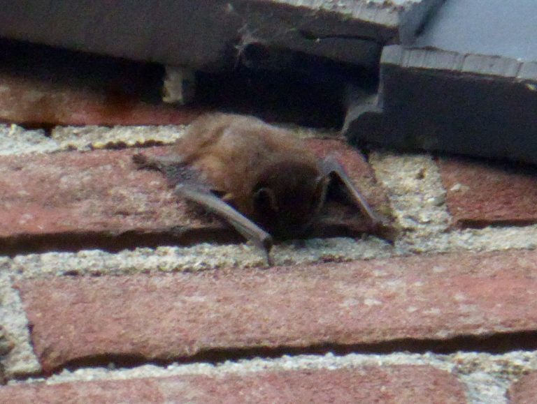 Met het warme zomerweer dat de afgelopen weken ons land binnen is geslopen, is het natuurlijk heerlijk toeven in je eigen achtertuin. Het loopt tegen Mariahemelvaart, de tijd dat ieder jaar de Perseïden meteorenzwerm zorgt voor een grote kans op vallende sterren aan de nachtelijke hemel. Eind juli zijn de eerste exemplaren te bewonderen, maar op het hoogtepunt rond 13 augustus kan dat met een beetje geluk oplopen tot tientallen vallende sterren per uur. U begrijpt dat ik tegen zonsondergang met deze zwoele avonden dan ook niet naar binnen te krijgen ben. Zo kwam het dus dat ik op een avond er achter kwam dat we onze woning met anderen delen. Terwijl het nog behoorlijk licht was zag ik iets met hoge snelheid rond ons huis fladderen. Ik dacht aanvankelijk dat het een zwaluw was, maar dan was het toch wel een zeer behendig exemplaar want hij kon de scherpste wendingen en bochten maken. Toen ik nog eens goed keek, leek het mij toch een vleermuis te zijn. Merkwaardig, want het was eigenlijk nog veel te licht voor deze nachtelijke avonturier. Dat leek hij zich kennelijk ook te realiseren want na nog wat rondjes fladderen keerde hij terug op zijn thuisbasis en ging vlak onder de dakrand op onze muur zitten, kennelijk wat beduusd door zijn eigen vroege enthousiasme. Gelukkig lang genoeg voor een kleine fotosessie mijnerzijds.