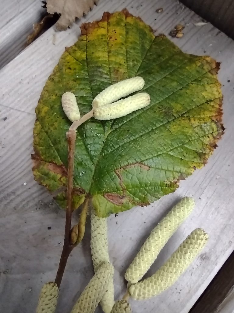 De mannelijke katjes die nu bloeien zijn al ontstaan in de zomer van het vorige jaar. Bij mijn volgende wandeling zal ik eens opletten of de vrouwelijke bloeiwijzen al zichtbaar zijn. Deze lijken op gewone bladknoppen maar laten zich later zien. Kijk naar de puntjes van die ‘bladknoppen’. De vrouwelijke bloeiwijzen lijken op rode pluimpjes met een kleverige stempel waarop het stuifmeel van de katjes neerkomt. En het bijzondere is dat ze pas aan het begin van de zomer uitgroeien tot hazelnoten, lang na de bestuiving.