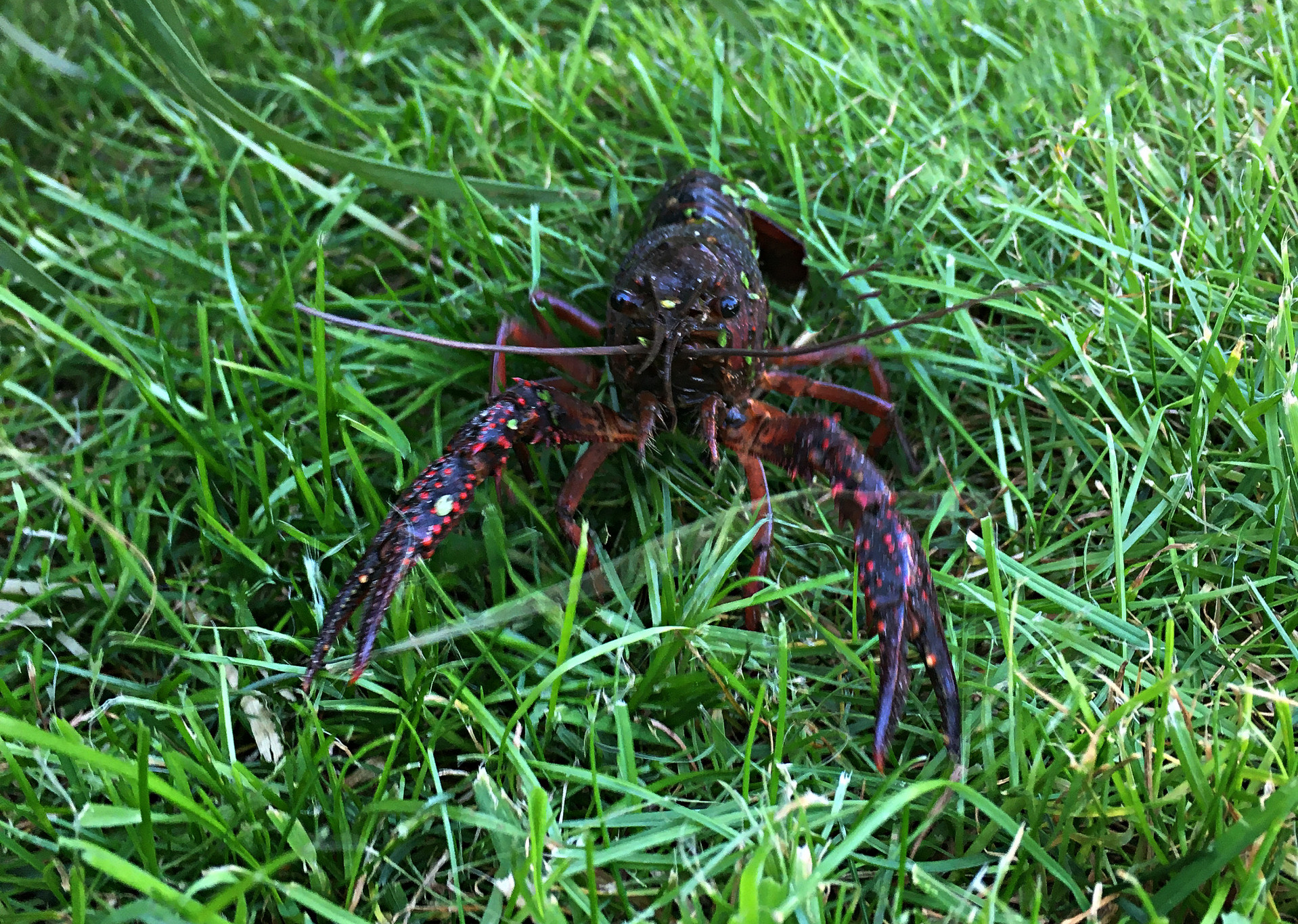 Op een dag was het zover. Natuurlijk waren er in mijn vijver al Amerikaanse rivierkreeften. Ze zijn immers overal. Alleen, ik had ze nog nooit gezien. Maar opeens besloot er een aan land te gaan. Hij (of zij, ik kan het verschil niet goed zien) had zich door de brede rietkraag gewrongen. En stond nu verbouwereerd op het gras achter de vijver. Wat kwam hij daar doen? Ik liep naar hem toe en zei: “Je bent niet uitgenodigd”. Als antwoord ging hij rechtop staan, zijn scharen in de lucht. Zijn typische dreighouding dus.