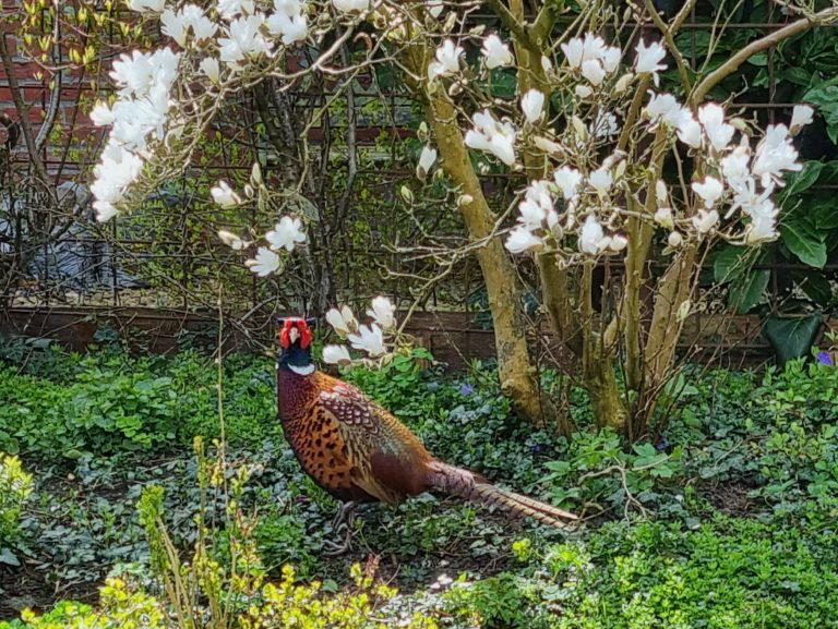 Als de fazant het gras onder de voedertafel heeft opgeruimd gaat hij naar de voortuin. Ook dat doet hij elke dag. Gek genoeg, want daar voer ik niemand. De fazant stapt er rustig rond en pikt hier en daar in de grond. Hij schijnt ook wel insecten te lusten en zelfs muizen. Maar die heb ik hem nog nooit zien eten. De voortuin is in dit seizoen eigenlijk het domein van de merels. Die hippen voortdurend rond, vooral om wormen te vinden. De merels komen niet op mijn voedertafel. De grote fazant besteedt amper aandacht aan de merels. Af en toe werpt hij een geringschattende blik op ze en dat is alles. Er is niets om over te vechten.
