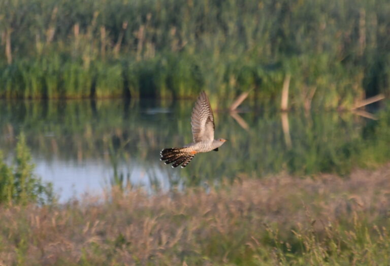 De laatste keren dat ik in de polder was, viel het me al op dat er overal gekoekoekt wordt. Inmiddels weet ik ook dat er (minstens) drie zitten in het gebied. Vanmorgen om 05.00 uur hoorde ik ze al. Eenmaal bij de Waverhoek zie ik ze alle kanten op vliegen. Eerst met zijn tweeën, later met zijn drieën. Ik heb niet het idee dat ze echt vechten in de lucht, het ziet er best vriendelijke uit. Zeker één van de drie is een vrouwtje want er wordt druk geflirt, gekoekoekt (door de mannetjes), gevlogen en gehinnikt (de vrouwtjes maken een soort lachgeluid). En dat allemaal boven mijn hoofd, langs me heen, in de bomen, laagvliegend over het riet en in de lucht. Ze vliegen achter elkaar aan, dansen door de lucht en maken vooral veel geluid. Ik word er zelf ook een beetje koekoek van … Ze laten elkaar alle hoeken van de Waverhoek zien en het gaat maar door. Worden die vogels nooit moe? Koekoek hier, koekoek daar, overal koekoek. In eerste instantie lijkt het een duif, als je beter kijkt lijkt het een (kleine) roofvogel en als je nog beter kijkt (en luistert) is het een koekoek. Een bijzondere vogel en veel mooier dan ik ooit had gedacht. Met zijn staartveren uit (waarschijnlijk om indruk te maken) is het een prachtige verschijning. Op de achtergrond hoor ik weer het gehoempapa van de roerdomp en ook de snor, de blauwborst en de rietzanger doen mee aan het ochtendconcert. Tot zover mijn ‘geluidenkennis’. Ondertussen zoekt het koekoeksvrouwtje straks naar een geschikt nest (van een andere vogel) om haar ei neer te leggen. Want zelf een nestje bouwen doen ze kennelijk niet aan. Ze gooit dan een ei van die (waard)vogel uit het nest en legt haar ei ervoor in de plaats tussen de andere eieren. Haar ei lijkt heel erg op de eieren die in het nest liggen en zo zien de ouders niet dat er een koekoeksei tussen ligt. De jonge koekoeken worden later gevoerd door hun ‘pleegouders’. Ik heb me laten vertellen dat een koekoek moeilijk te spotten is maar kennelijk hebben ze het vandaag zo druk met het veroveren van het vrouwtje dat ze mij niet hebben opgemerkt. Ik sta hier en mag getuige zijn van drie verliefde koekoeken in de polder!