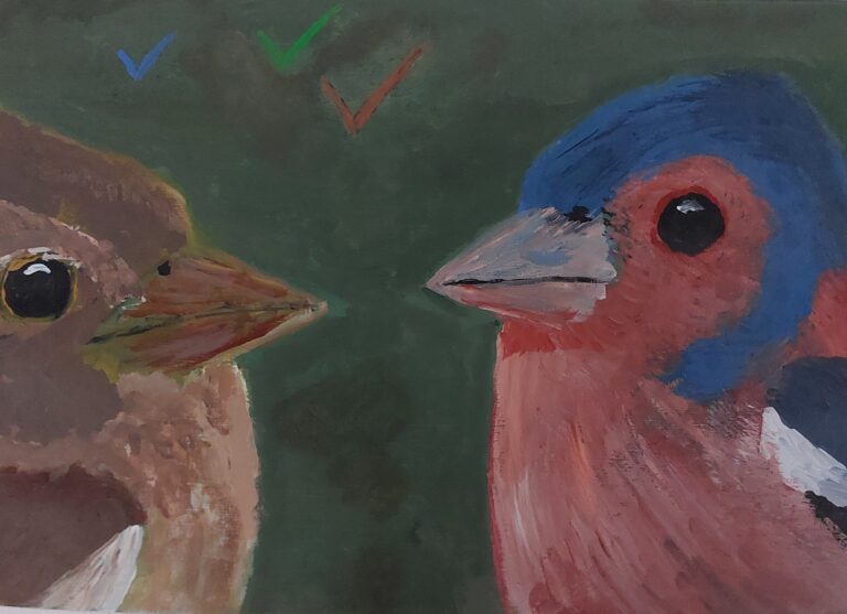 Ons lied klinkt kort en krachtig, afgerond met een snelle heftige roller, de vinkenslag. De vink met de meeste rollers in een uur sloeg een goede slag en won die zangwedstrijden. Weet je niet hoe dat klinkt? Luister dan maar eens op vogelgeluid.nl. Goede kans dat je ons daarna kan aanvinken als ‘aanwezig’ in je buurt, tenminste als daar tuinen zijn, of een park of bos, en men niet teveel heeft gekozen voor tegel-‘tuinen’, want daar vinden wij geen voedsel of beschutting. In dat geval zul je wellicht een vinkje achter onze naam kunnen zetten op de lijst van ‘door ontgroening verjaagde vogelsoorten’. Met dat vinkje moet je het dan maar doen…