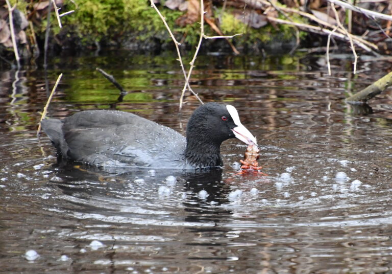 Het is vandaag een droge winterdag. Eindelijk even geen regen maar een klein beetje zon. Ik wandel met de hond langs een slootje. Ze is erg van het snuffelen en vooral vandaag neemt zij er echt de tijd voor. Het schiet dus niet echt op maar ik geniet van het moment buiten en kijk om mij heen. Terwijl zij haar ding doet, zie ik in de sloot een meerkoet duiken naar een rivierkreeft. De pootje steken aan alle kanten uit het water. Hij neemt een hapje, laat de kreeft los om hem vervolgens daarna weer op te duiken. Ik aanschouw het tafereeltje terwijl de hond nog steeds van alles ruikt. Er komen twee dames aan. De een zit in de rolstoel, de andere duwt haar voort. We groeten elkaar en dan blijven ze even staan. De dame achter de rolstoel vraagt mij nieuwsgierig naar wat voor moois ik stond te kijken. Ik wijs naar de meerkoet en vertel dat hij al een tijdje bezig is een rivierkreeft op te eten en hoe hij dat doet. Ze kijken beiden die kant op, ‘oh ja, zeggen ze kijk nou toch wat leuk’. De meerkoet duikt weer naar beneden en verwonderd kijken ze naar de half aangevreten rivierkreeft die uit zijn bek hangt. Als ik langzaam doorloop met de hond zie ik dat ze de rolstoel richting de waterkant heeft gedraaid en dat ze samen verder kijken. ‘Ik wist helemaal niet dat die beesten ook rivierkreeften eten’ hoor ik de mevrouw zeggen. Beiden kijken naar het water, terwijl ze daar normaal waarschijnlijk gewoon langs waren gelopen zonder dat ze iets was opgevallen. Als ik de bocht omga, zie ik dat ze nog steeds naar de meerkoet in het water staan te kijken. Ik glimlach en voel me al een beetje een natuurgids. Mensen attent maken op de mooie dingen die zo gewoon lijken of niet opvallen in de natuur maar die ontzettend leuk en interessant zijn om even bij stil te staan en naar te kijken. Het rondje om van de dames werd ineens aangevuld met een extraatje waar ze straks nog over zullen praten: ‘wist jij dat de meerkoet rivierkreeften eet? Wij zagen er één in de sloot …’ Ondertussen kijk ik naar een grote reiger langs de waterkant, loerend naar een visje. Ik blijf even staan om te zien of hij wat vangt.