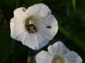 of is hij dood? Dat vraag ik me af als ik langs een bloem loop en een ogenschijnlijk levenloos exemplaar in de kelk van de haagwinde zie liggen. Normaal zijn deze diertjes druk bezig met het verzamelen van stuifmeel maar nu doet hij helemaal niks. Ik blijf even staan kijken, het ziet er vredig uit en ook wel schattig. Met zijn wollige lijfje ligt hij daar dus te slapen (want ik heb het nagevraagd en het is echt zo). Van een hele dag heen en weer vliegen worden ze heel erg moe en dan gaan ze slapen op of onder een bloem of zoals deze in de kelk van een haagwinde. Voordeel voor mij is wel dat ze zich makkelijk laten fotograferen. Waar ik overdag nog regelmatig mis schiet en alleen de bloem in beeld heb omdat de hommel alweer in een volgende kelk hangt, kan ik hem nu van dichtbij bestuderen en dan zie je dat het echt een heel mooi beestje is. Volgens mijn app is dit een aardhommel. Nooit geweten dat er zoveel (enkele tientallen) soorten zijn en zoveel (soms kleine) verschillen waaraan je dat kunt zien. Je hebt bruinruggen, roodkonten, geelkonten en witkonten. Daaronder wordt het weer verdeeld in veldhommel, tuinhommel, heidehommel, veenhommel, akkerhommel en ga zo nog maar even door.