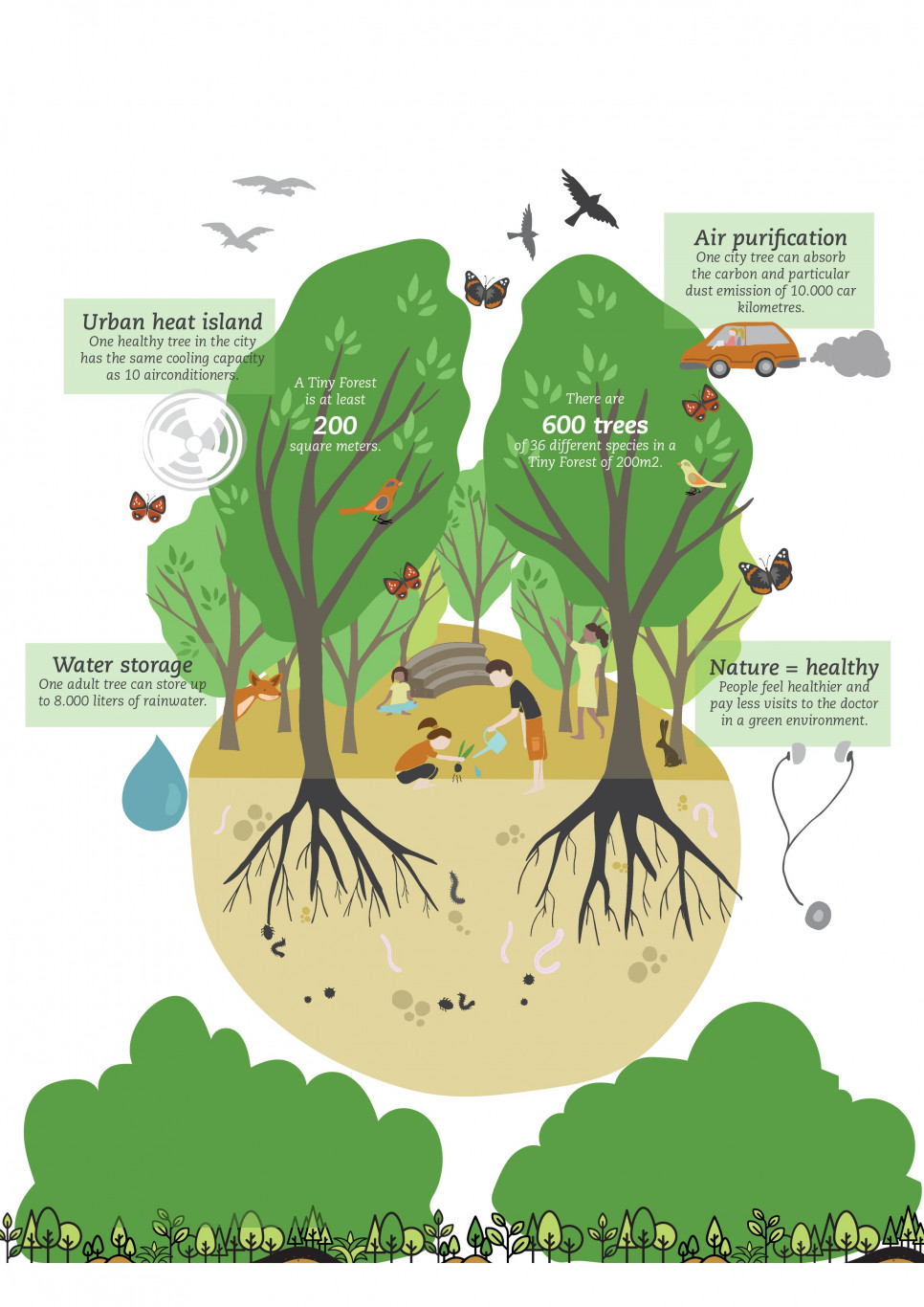Een nieuw fenomeen, daarom een korte uitleg: een Tiny Forest is een dichtbegroeid, inheems (mini)bos in een woonwijk. Dit bos is niet alleen een prettige plek voor vlinders, vogels, bijen en kleine zoogdieren, maar ook voor mensen. Kinderen leren in het buitenlokaal over de Nederlandse natuur, en buurtbewoners ontmoeten elkaar op een prettige en gezonde plek. De bedoeling is dat elke gemeente in Nederland één of meer van deze minibossen opzetten en laten verzorgen door kinderen van 4 – 10 jaar. Het IVN speelt een sleutelrol in de organisatie. Meer informatie