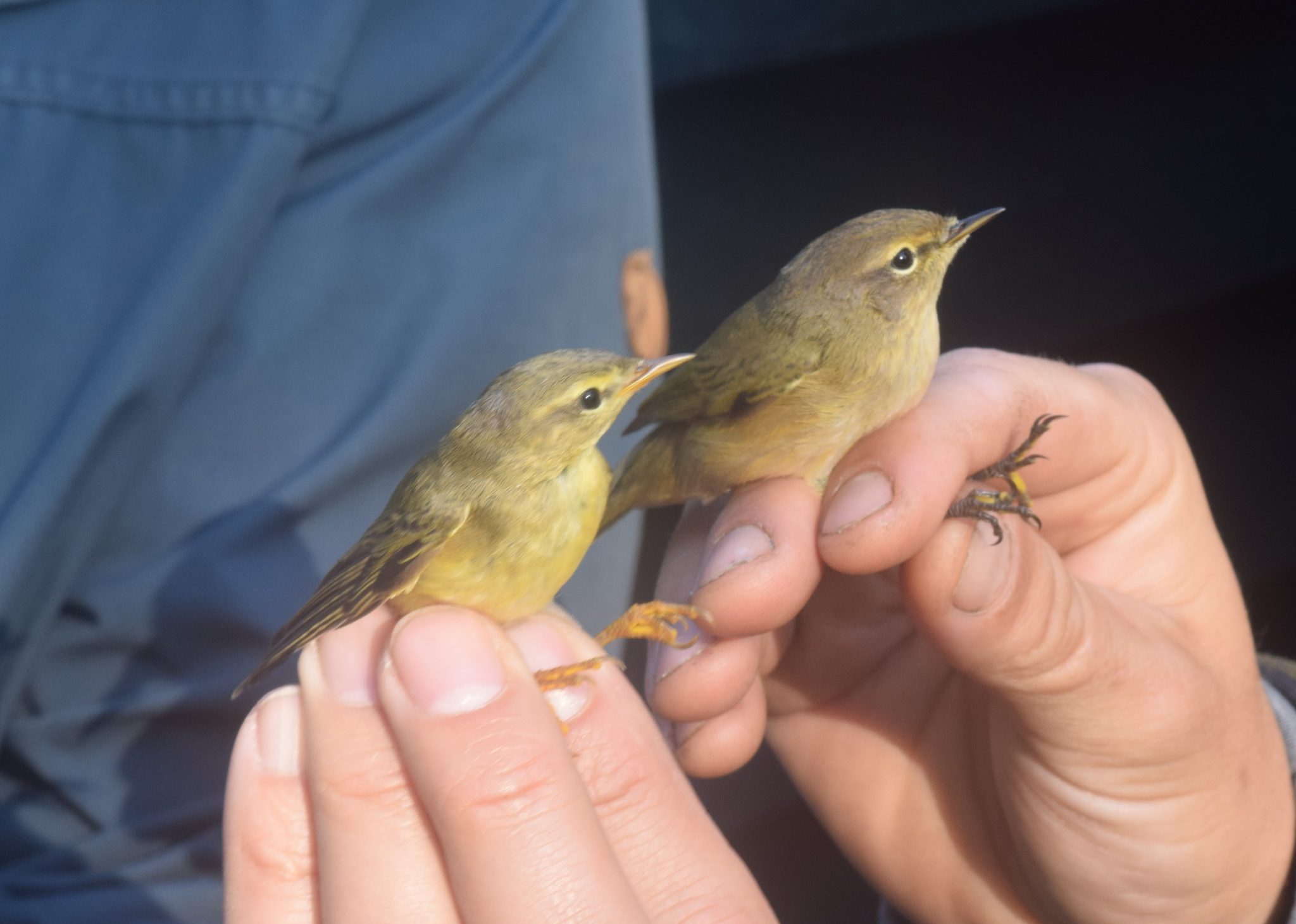 De vraag is waarom dit verschil in aankomst- en vertrektijden. Tjiftjaffen overwinteren in Spanje, Portugal en Noord-Afrika, fitissen zoeken hun overwinteringsgebied veel verder weg, bij Gibratar zijn ze pas halverwege, dan moeten ze de Sahel nog over voor ze er zijn. Dat scheelt wel een stukje vliegen. Kun je dat ook zien aan hun uiterlijk? Kijk nog eens goed naar de foto, je ziet dat de linker vogel, de fitis, langere vleugels heeft dan de rechter, de tjiftjaf. Dat geeft meer vliegdynamiek.