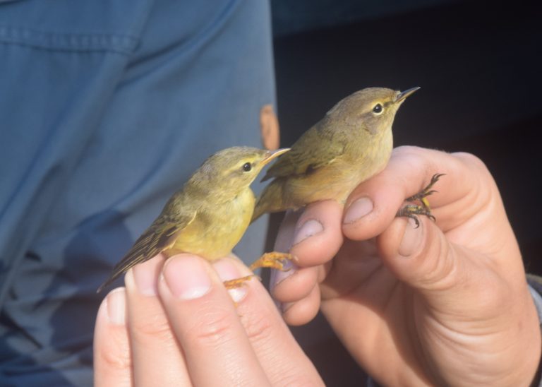 Op de foto ziet u twee vogeltjes, kijk er eens goed naar. Het zijn een fitis en een tjiftjaf, ziet u verschillen? Misschien ziet u de kleur van de pootjes, en ja, het snaveltje van de linker is ook iets lichter. De rechter heeft een duidelijk gesloten gele oogring en een iets bollere kop. Maar is dat voldoende voor hun vrouwelijke soortgenoten om opgewonden te raken? Ook voor ervaren vogelaars is het vaak moeilijk om ze zo uit elkaar te houden, ze noemen ze dan ook wel KBV’tjes, kleine bruin-gele vogeltjes. En toch zijn ze voor de vrouwen onder deze vogelsoorten en voor vogelaars belachelijk gemakkelijk te herkennen, je hebt gewoon oren nodig!