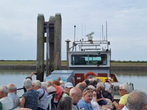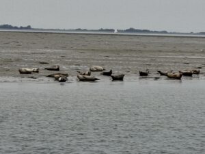In het kader van het 50 jarig bestaan bezochten wij dit maal een “nat” natuurgebied: het nationaal park Oosterschelde. Met de Zwerver, een voormalige vissersboot, die tegenwoordig wordt ingezet voor rondvaarten en tochten met sportvissers, ging het richting de zandplaten ten oosten van de Zeelandbrug, waar vele zeehonden liggen “te zonnen”. Al direct bij het vertrek uit de haven bij de Bergdiepsluis stak een nieuwsgierige zeehond zijn kop boven water. De bruinvissen, die we onderweg hoopten te zien hielden zich helaas verborgen. Dat werd ruimschoots goed gemaakt door het showtje dat enkele zeehonden ons boden door als bruinvissen boven water te springen. Na een lunch aan boord was er een interessante wandeling door het natuurgebied De Pluimpot op het eiland Tholen.